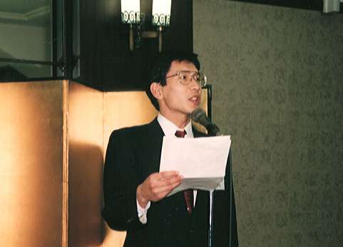 東大新報代表・秋山正樹君が挨拶。