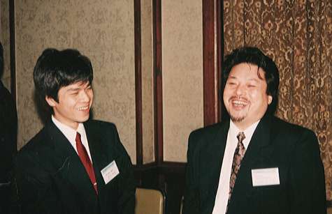 談笑するOBと編集部員(右は福島啓史郎氏)