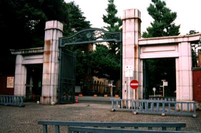 正門が造られたのは明治45年(1912)6月のこと。本郷通りが整備され、本学の西側の境界線が確定したことによって、それまでの「仮正門」に替わって造られた。当時の総長は濱尾新(はまおあらた)で、濱尾総長は東京市内の邸宅を自ら見て歩き、赤坂見附にあった閑院宮廷という屋敷の門をたいへん気に入り、これをもとに現在の正門を造らせたと言われている。設計は和洋折衷型の建造物を得意とした伊東忠太が担当した。