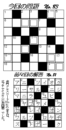 今回もオーソドックスな問題です。クロスができ上がったら、二重ワクのなかの文字を適当に並べると、話題になっている言葉が出てきます。それが今回の答えです。がんばって解いてみてください。(出題S・S)