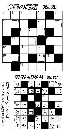 今回はカタカナではなく、アルファベットを入れて下さい。クロスができ上がったら、二重ワクのなかの文字をABCDEFの順に並べると、ある英単語が出てきます。それが今回の答えです。難しいかもしれませんが、がんばって解いてみてください。(出題A・Y)