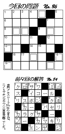 今回はやや難しい問題です。クロスができ上がったら、二重ワクのなかの文字を適当に並べると、最近よく耳にすることばが出てきます。それが今回の答えです。がんばって解いてみてください。(出題S・S)