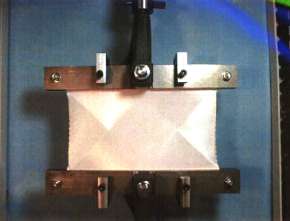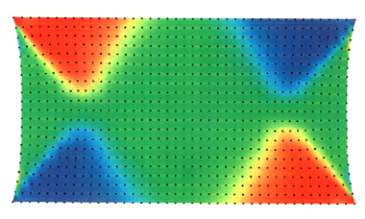 グラスファイバーを平織した 布の引張実験(糸の傾き45°) |  | | 開発した手法によるシミュレーション結果 | 有限要素法では、物体を連続体、すなわち均質でひとかたまりであるとみなすことを出発点とする。そのため、鋼構造物等の硬くて塊状の機械・構造物については精度よく安全性が評価できるとされているが、柔らかで縦糸と横糸が絡み合っている布については評価が難しいとされてきた。