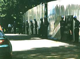 | 反対する学生との衝突を警戒 して、ガードマンも動員された |